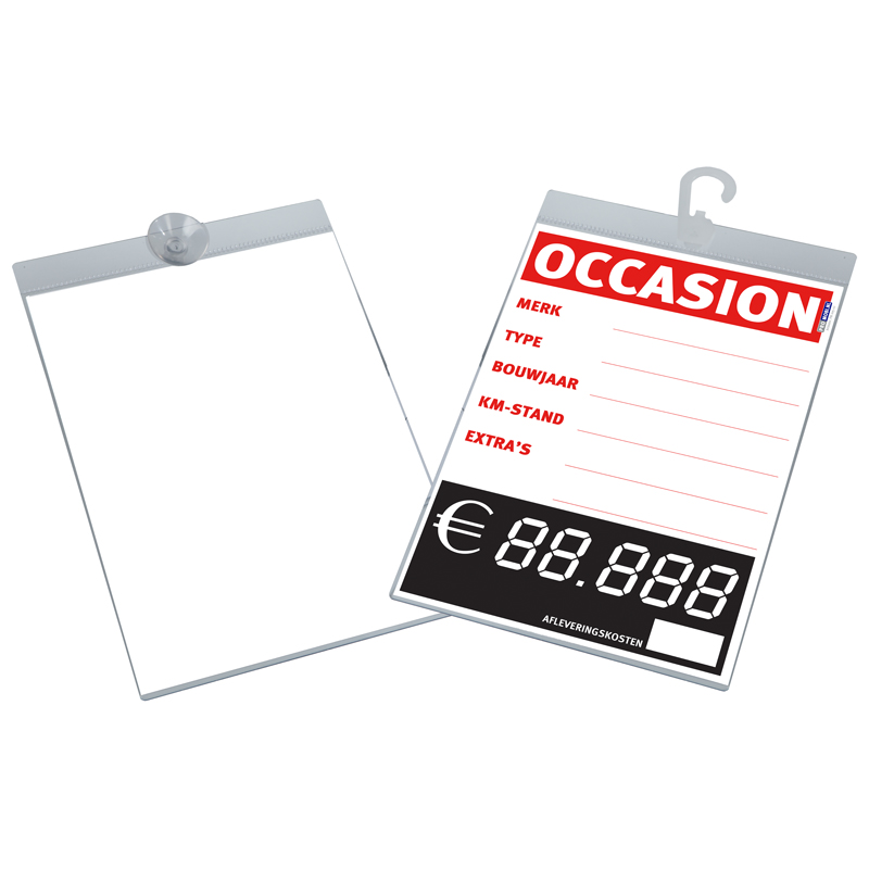 Prijskaarthouder inclusief zuignap en haak. Leverbaar in horizontale (PM035-01) en verticale (PM035-02) uitvoering.