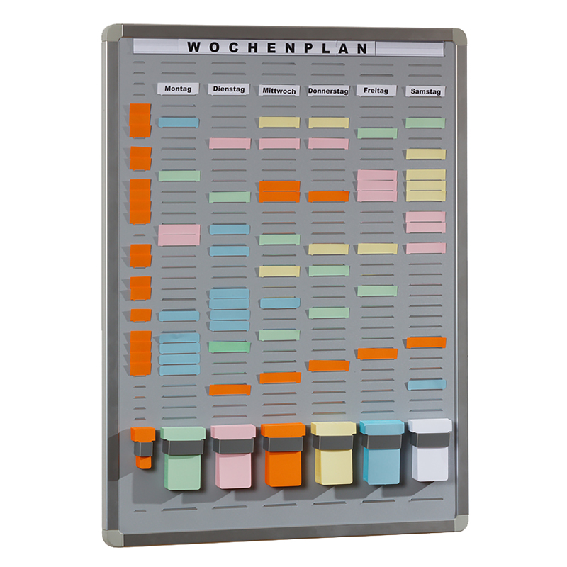 Handig planbord voor uw planning in de werkplaats. Door middel van de diverse kleuren T-plankaartjes (PM119-..) heeft u alles overzichtelijk en helder in beeld.