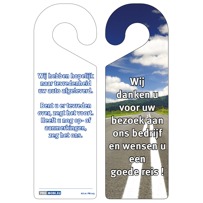 Stevige autospiegelhanger, 300 gr/m2, dubbelzijdig gedrukt, met ruimte voor een bedrijfsstempel.