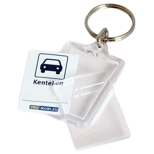 Eenvoudige sleutelhanger van plexiglas en los tekstkaartje.