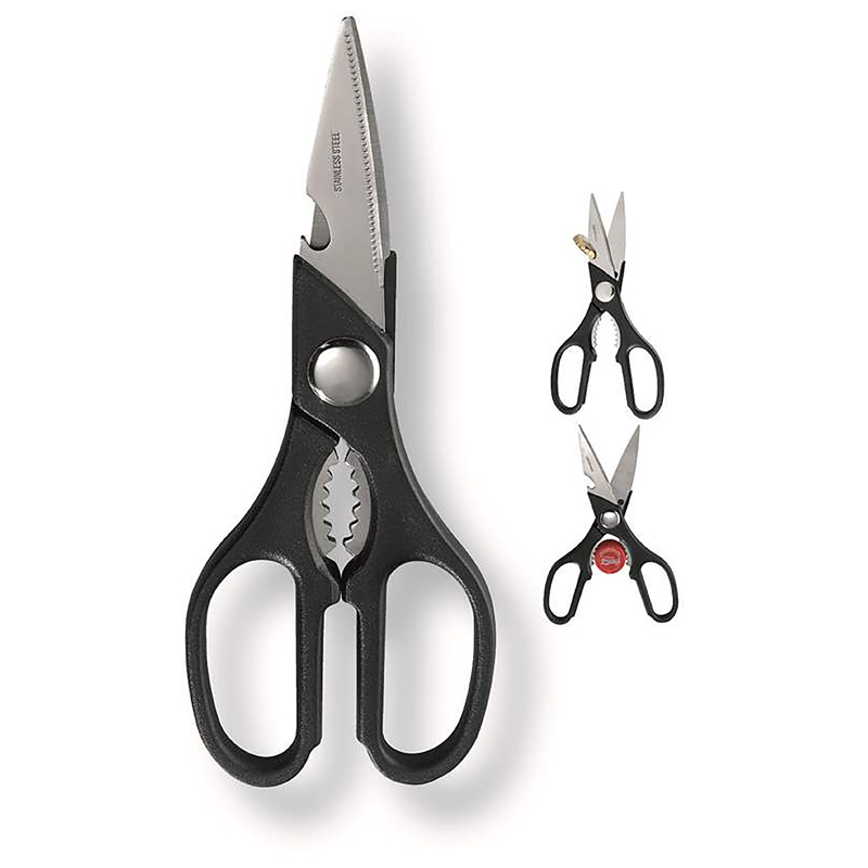 Universele schaar met extra functies. Massief RVS draaischarnier, grote handgrepen. Flesopener of draai de dop van een frisdrankfles gemakkelijk open. VPE 1st.