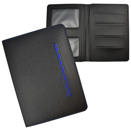 Robuust kunstlederen kentekenetui met blauw stiksel, met ruimte voor 6 creditcardformaat pasjes en 2 insteekvakken voor papieren. VPE 20st.