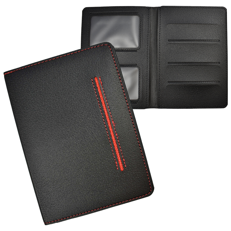 Robuust kunstlederen kentekenetui met rood stiksel, met ruimte voor 6 creditcardformaat pasjes en 2 insteekvakken voor papieren. VPE 20st.
