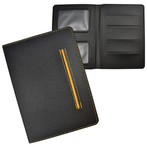 Robuust kunstlederen kentekenetui met geel stiksel, met ruimte voor 6 creditcardformaat pasjes en 2 insteekvakken voor papieren. VPE 20st.
