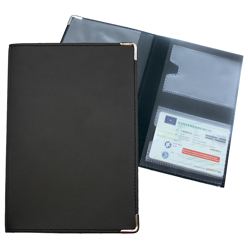 Kentekenetui met metalen hoekjes, 3-delig transparant binnenwerk en 2 extra creditcardvakjes voor bv. de kentekencard, kleur zwart. VPE 20st.